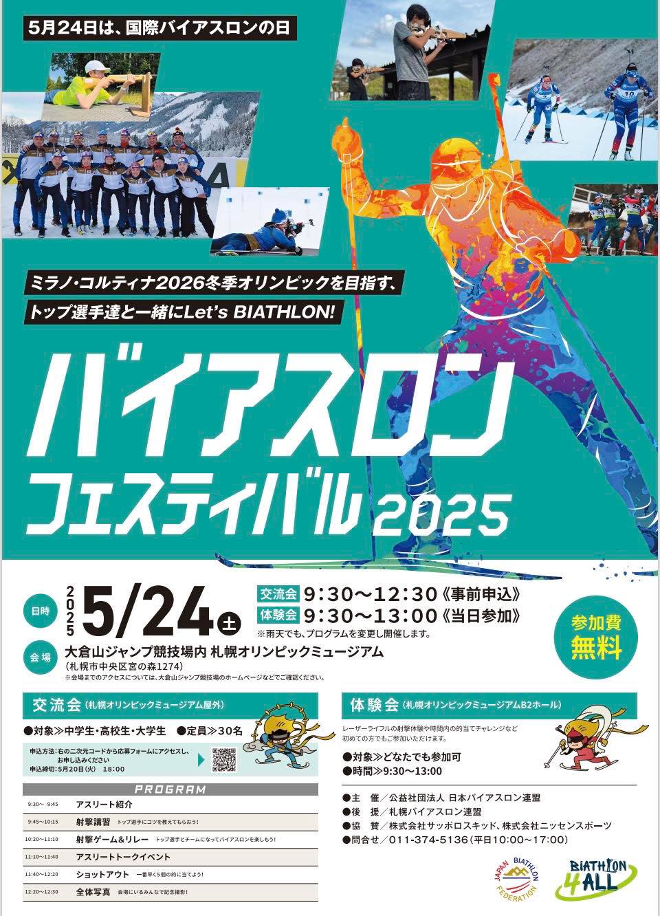 05 15 バイアスロンを体験しよう!】 Category : お知らせ , 札幌オリンピックミュージアム by ABE 2025年5月24日、札幌オリンピックミュージアムで「バイアスロンフェスティバル2025」を開催します! スキー × 射撃のスリルを体感してみませんか?初心者も大歓迎 小学4年生~大学生を対象に、射撃ゲームやリレーが楽しめる交流会も同時開催! 家族で、友達と、ぜひ遊びに来てください! 交流会は以下から申し込みください! https://docs.google.com/…/1FAIpQLSeT3…/viewform #札幌オリンピックミュージアム #バイアスロン競技 コメントを残す コメントをキャンセル メールアドレスが公開されることはありません。 * が付いている欄は必須項目です 名前 * メールアドレス * ウェブサイト 上に表示された文字を入力してください。 コメント 2025年5月15日 | Category: お知らせ , 札幌オリンピックミュージアム | No Comment