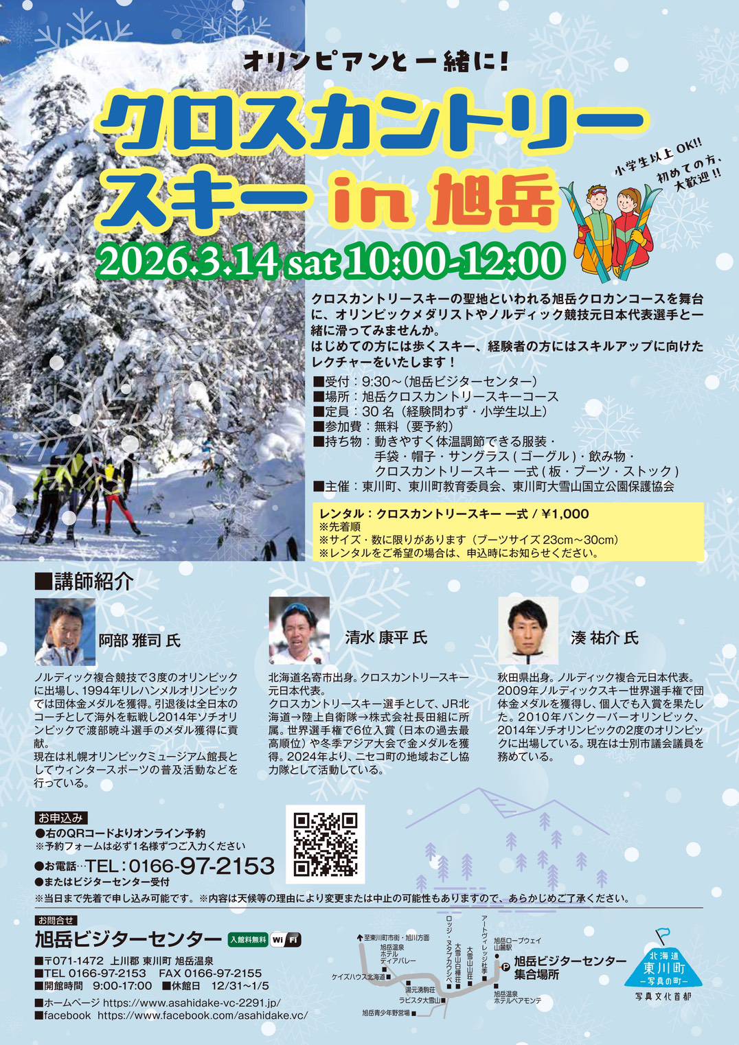02 19 クロスカントリースキー in 旭岳 Category : SKI , お知らせ by ABE 今年も「クロスカントリースキー in 旭岳」を開催します! 📅 2026年3月14日(土)10:00〜12:00 📍 旭岳クロスカントリースキーコース 初心者大歓迎!小学生以上OK✨ はじめての方には歩くスキー体験、経験者にはスキルアップレッスンもあります! 定員30名(要予約)なのでお申込みはお早めに!▶︎レンタルあり(¥1,000) ▶︎申込はチラシのQRコードまたはお電話で コメントを残す コメントをキャンセル メールアドレスが公開されることはありません。 * が付いている欄は必須項目です 名前 * メールアドレス * ウェブサイト 上に表示された文字を入力してください。 コメント 2026年2月19日 | Category: SKI , お知らせ | No Comment