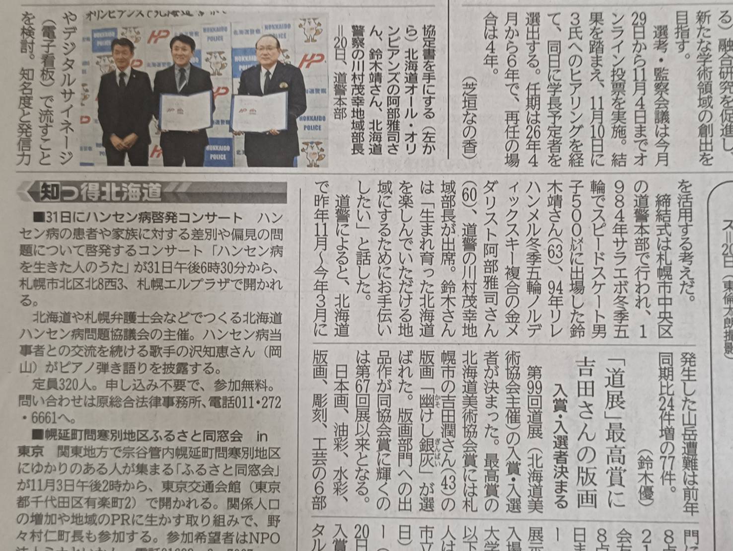 10 21 北海道警察×北海道オールオリンピアンズ Category : お知らせ by ABE 昨日、北海道警察 × 北海道オールオリンピアンズが 🏔️山岳遭難防止の連携協定を締結しました! GM鈴木靖さんと一緒に参加し、 増加しているバックカントリーでの事故防止に向け、 オリンピアンとして発信していきます💪 今後は交通安全や詐欺防止など、 さまざまな形で連携予定です✨ 高校の同級生でもある北海道警察地域部長に感謝です🙏 2025年10月21日 | Category: お知らせ | No Comment